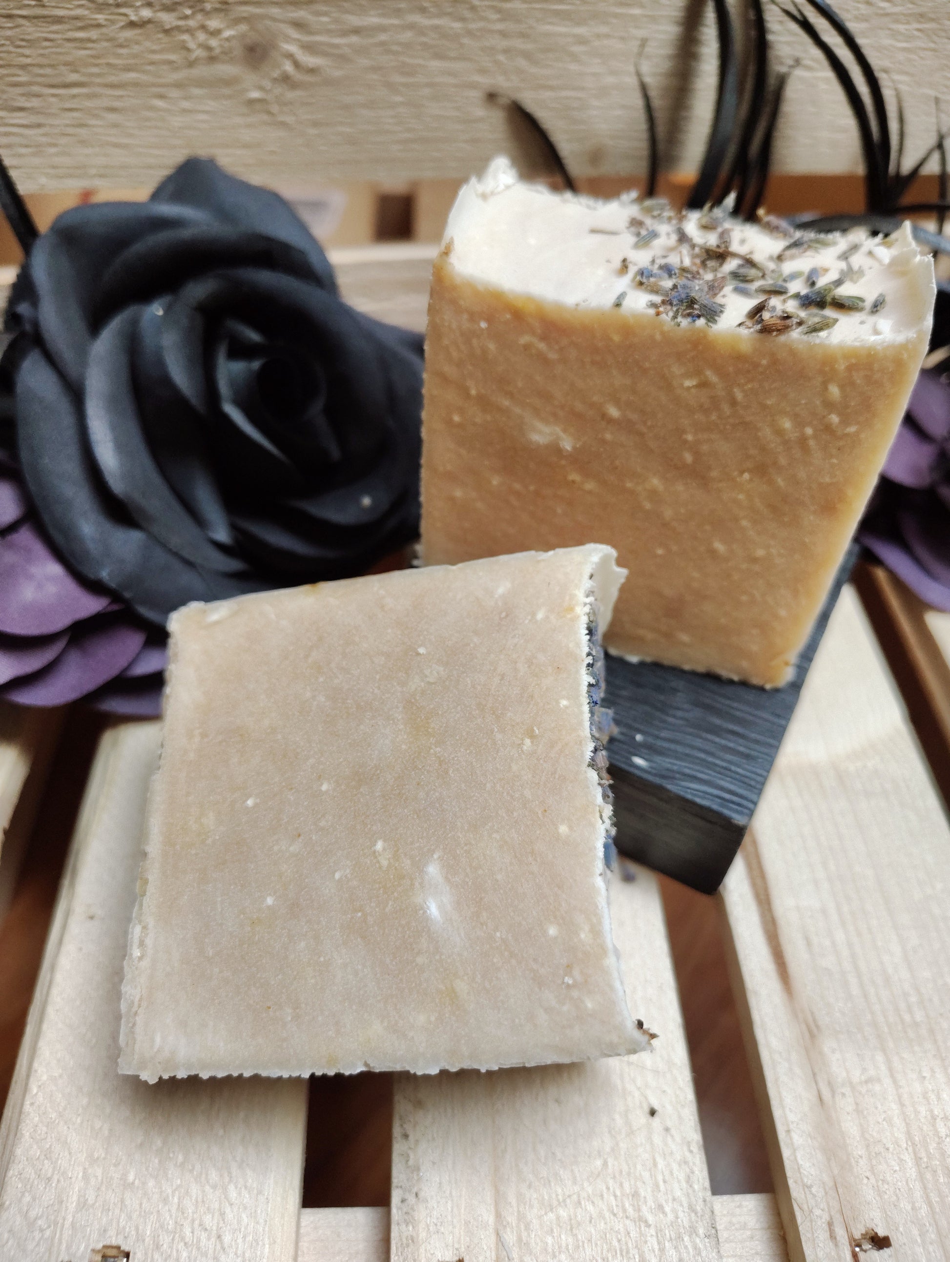 Ingredients: Tallow, goat milk, olive oil, sodium hydroxide, shea butter, essential oil, kaolin clay, lavender buds